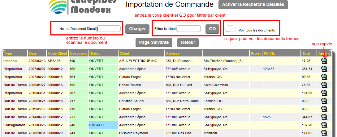 Si vous connaissez le numéro de commande directement vous pouvez l'inscrire ou le "scanner" dans la case No. de document direct.
