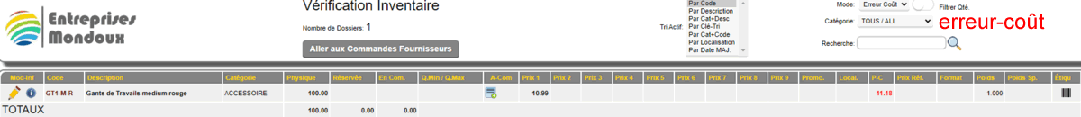 En mode erreur de coût, la fonction permet de détecter la conformité des coûts VS le prix vendu.