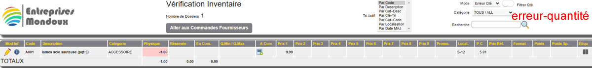 En mode erreur de quantité, la fonction permet de visualiser les items en quantité négatives (plus vendus que reçus ou achetés).