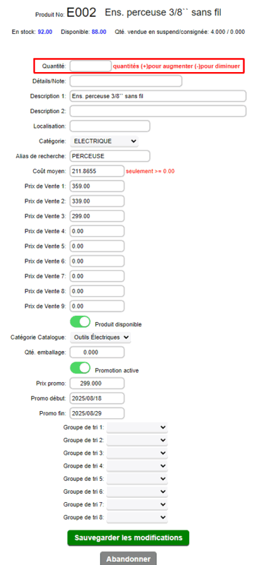 En mode 2 (ADMIN): Si permis, permet d'ajuster certaines informations de la fiche produit et permet d'ajuster la quantité inventaire.
